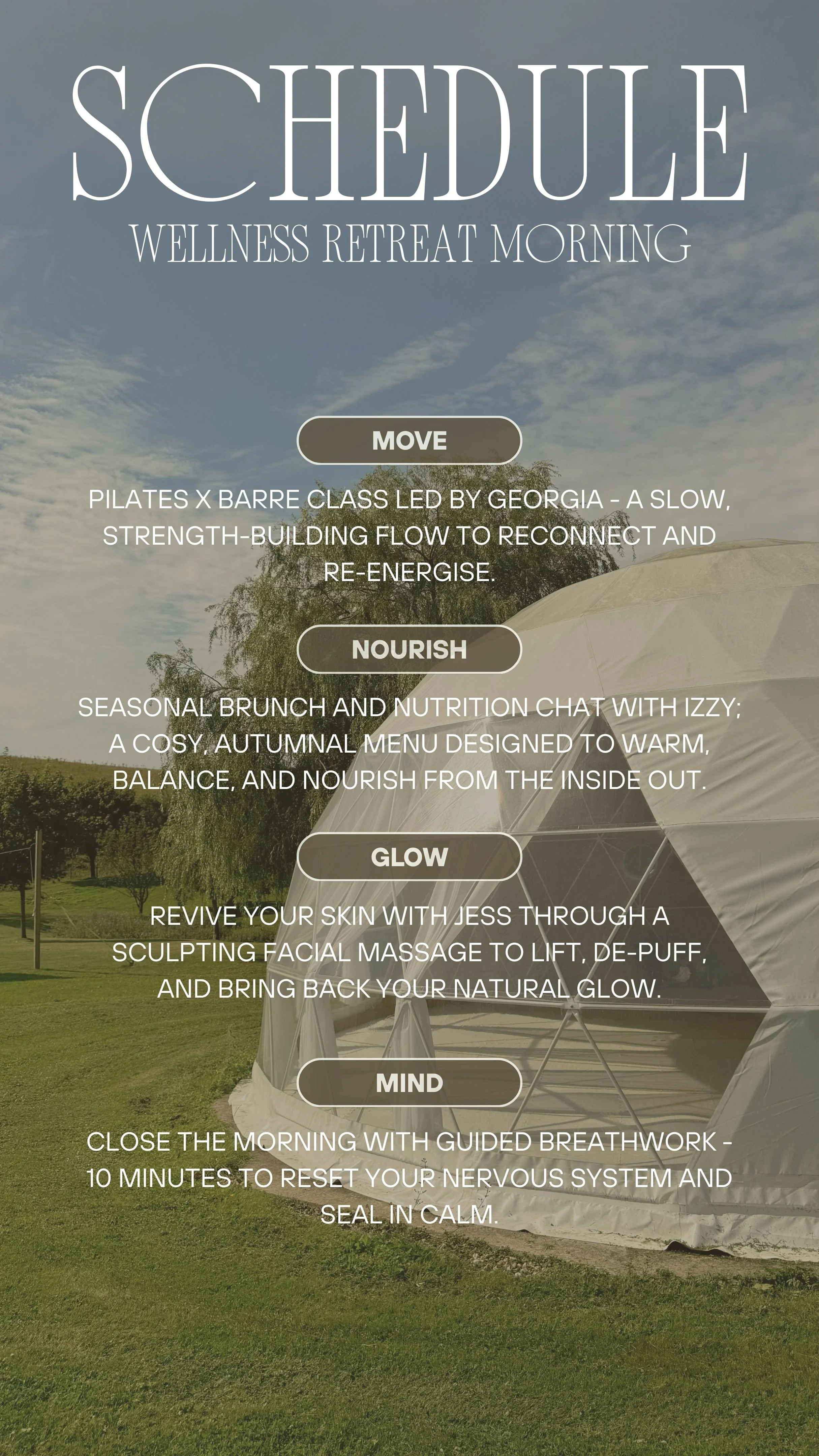 Move and connect with your body with a full body pilates and barre fusion flow by Georgia. Learn how to nourish yourself from within from a nutrition workshop led by Izzy with seasonal refreshments to accompany. Follow a step by step facial sculpting masterclass. Finish with a mindful meditation and cosy hot cacao.